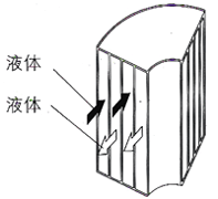 對于進行換熱的兩種介質,如果都是液體,在螺旋板式換熱器的六道中是按螺旋方向流動的,如圖二,并且按逆流的方式流動,所謂逆流是指相鄰流道中兩種液體流動的方向相反,這樣能使兩流體在相互傳熱的流程中始終保持一定的溫差,從而可獲得較好的效果。