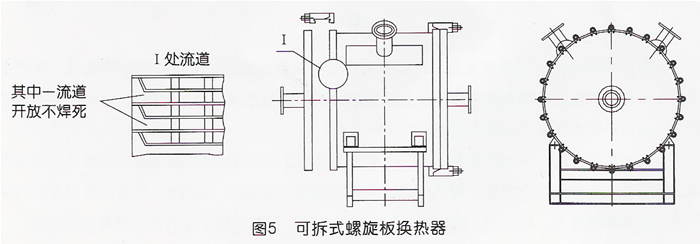 卷制后的螺旋板式換熱器,每端只將一個流道焊死,而 另一個流道開放,然后在端面上加端蓋加以密封。其端蓋可以拆卸,從而清理流道內部。它適用于易堵塞的流體換熱。