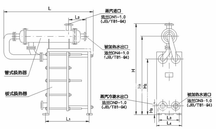 In order to overcome the disadvantage of low operating temperature of the traditional plate heat exchanger, when the hot side medium is steam whose temperature exceeds the design temperature of the sealing gasket, a cooling and decompression device is installed on the plate heat exchanger to ensure the stable and reliable operation of the equipment. For convenience of installation and design, the overall dimensions of the steam-water heat exchanger are given in the sample for reference only. The following are typical models, and the final design needs to be confirmed by the technical department of our company.
